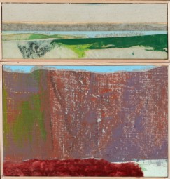 This is a series of 8 smaller works, 4 measuring 20 x 30 cm, the others 10 x 30 cm. They are presented here as diptychs, but can be acquired individually, or mixed and matched as desired, depending on availability. The large frame (3cm deep) designed and realized by the artist, allows each piece or diptych to stand freely as an object.