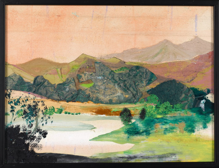 26,5 x 34,5 cm – Oil and acrylic on canvas. Black wooden frame 1 x 1 cm, behind glass.