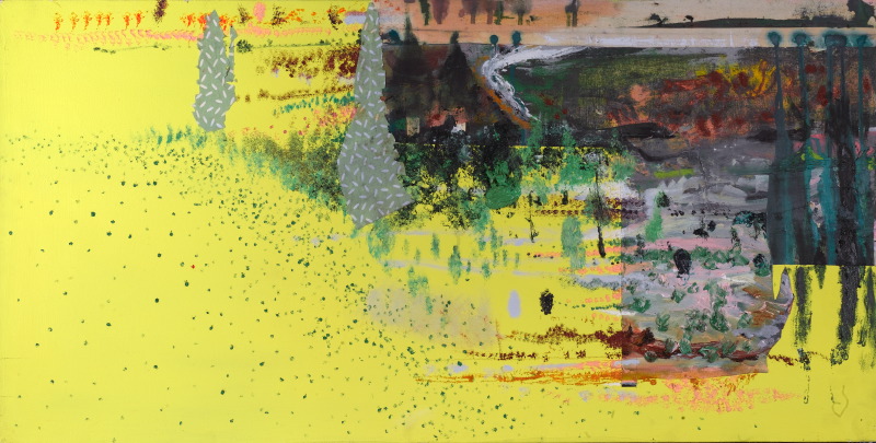 55 x 110 cm – Oil and acrylic on canvas; pieces of canvas and fabric marouflés on canvas.