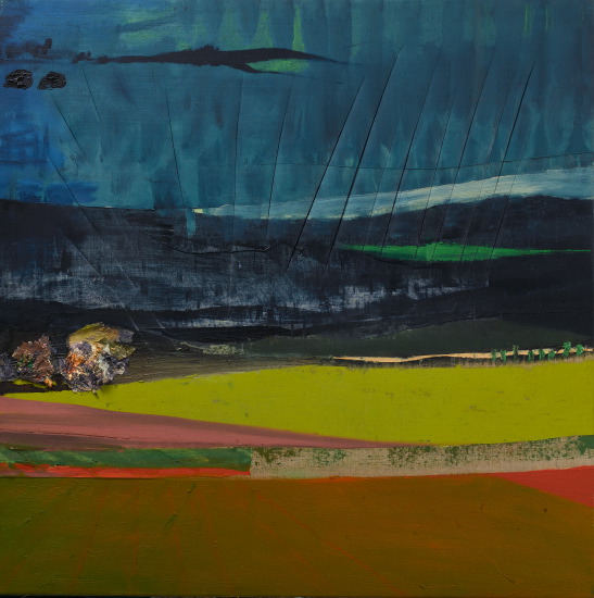 100 x 100 cm – Oil, tape and recycled material on canvas, lacerations. Right side of diptych. Framed. Black piece of cloth at back. Signed.