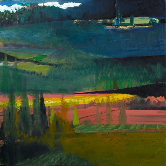 100 x 100 cm – Oil, acrylic and tape on canvas. Left side of diptych. Framed. Unsigned.