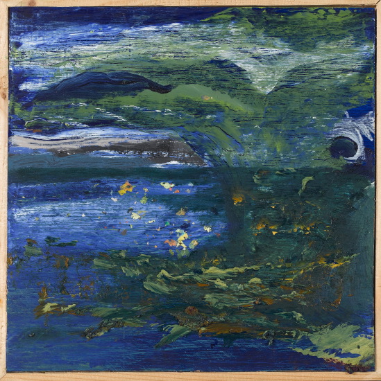 25 x 25 cm – Oil, acrylic, and bits & pieces on wood. Frame: natural pine 0,5 x 6 x 2,5 cm.