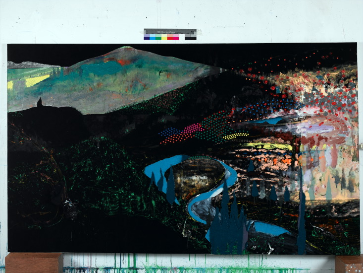 140 x 235 cm- Oil, acrylic, pieces of canvas, woolen blanket, tape, gommettes, tube of paint and recycled materials on black velvet. Framed.