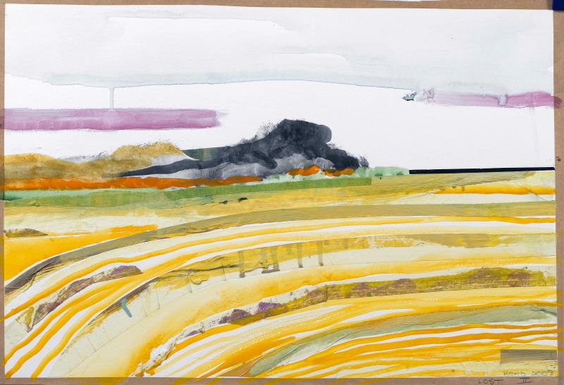 38 x 56 cm – Watercolor with oil and acrylic on tape on paper. Framed. Signed in front, at lower right.