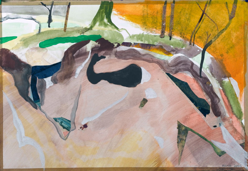 38 x 56 cm – Watercolor with oil and acrylic on tape on paper. Signed in front, at lower right.