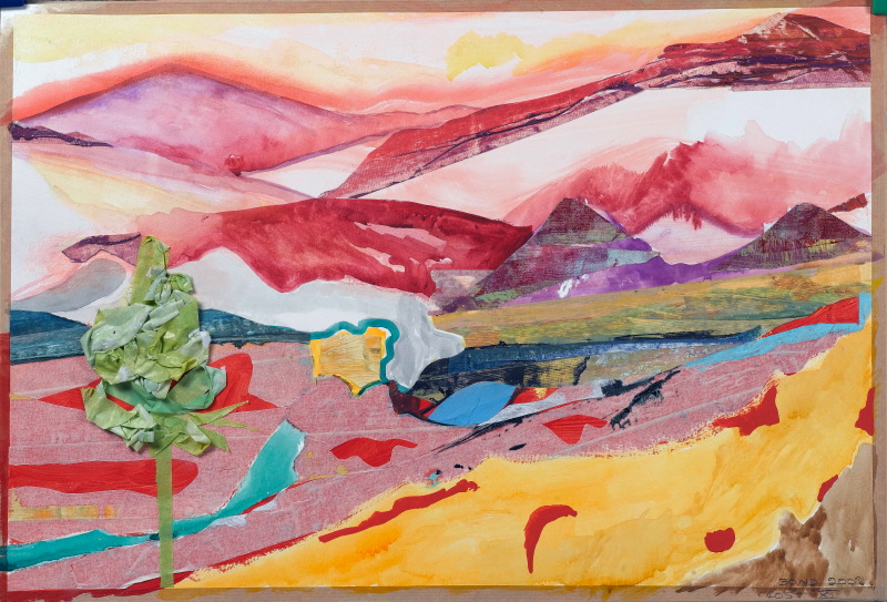 38 x 56 cm – Watercolor with oil and acrylic on tape on paper. Signed in front, at lower right.