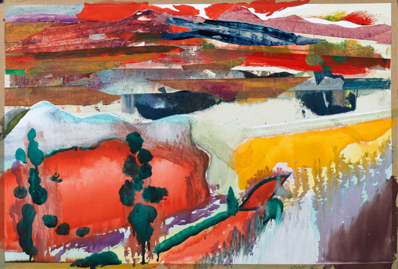 38 x 56 cm – Watercolor with oil and acrylic on tape on paper. Signed in front, at lower right.