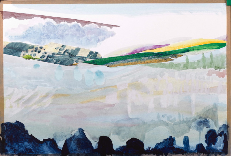38 x 56 cm – Watercolor with oil and acrylic on tape on paper. Signed in front, at lower right.