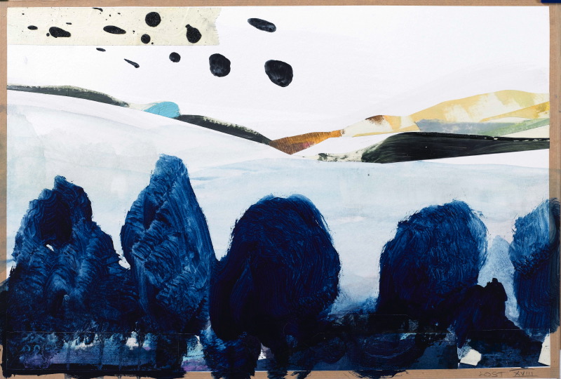 38 x 56 cm – Watercolor with oil and acrylic on tape on paper. Signed in front, at lower right.