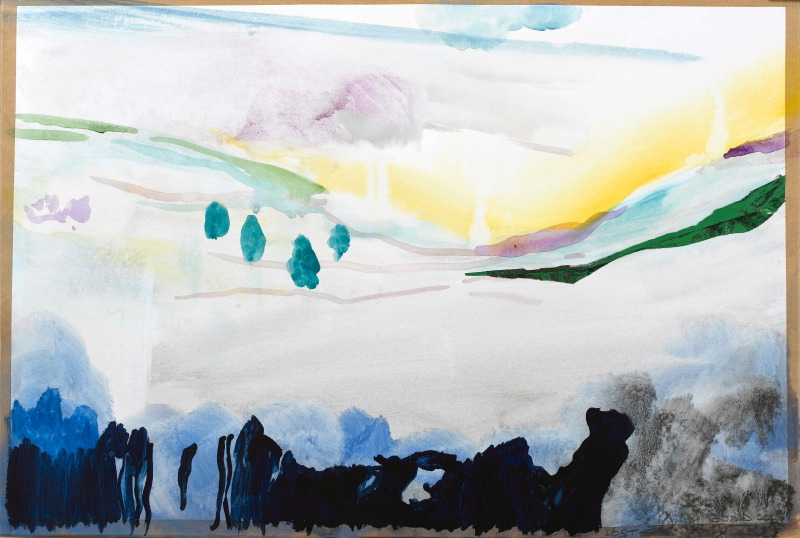 38 x 56 cm – Watercolor with oil and acrylic on tape on paper. Signed in front, at lower right.