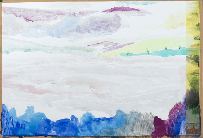 38 x 56 cm – Watercolor with oil and acrylic on tape on paper. Signed in front, at lower right.
